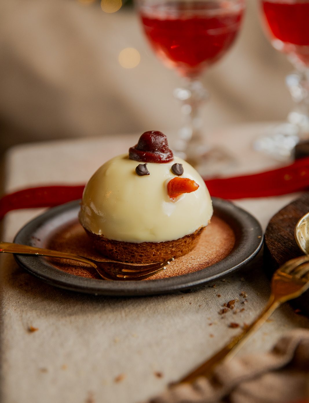 Een tartelette in de vorm een sneeuwpop! Harde wener bodem gevuld met amandelspijs, sinaasappel bavaroise