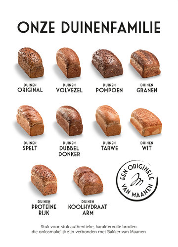 Het allereerste lid van onze Duinenfamilie! Dit stoere meergranenbrood zit bomvol zonnebloempitten, lijnzaad en stukjes hazelnoot. Sinds de introductie van dit brood in 1980 is het brood nog steeds bij velen (ook bij kinderen!) dé favoriet. Lekker tot de laatste kruimel…