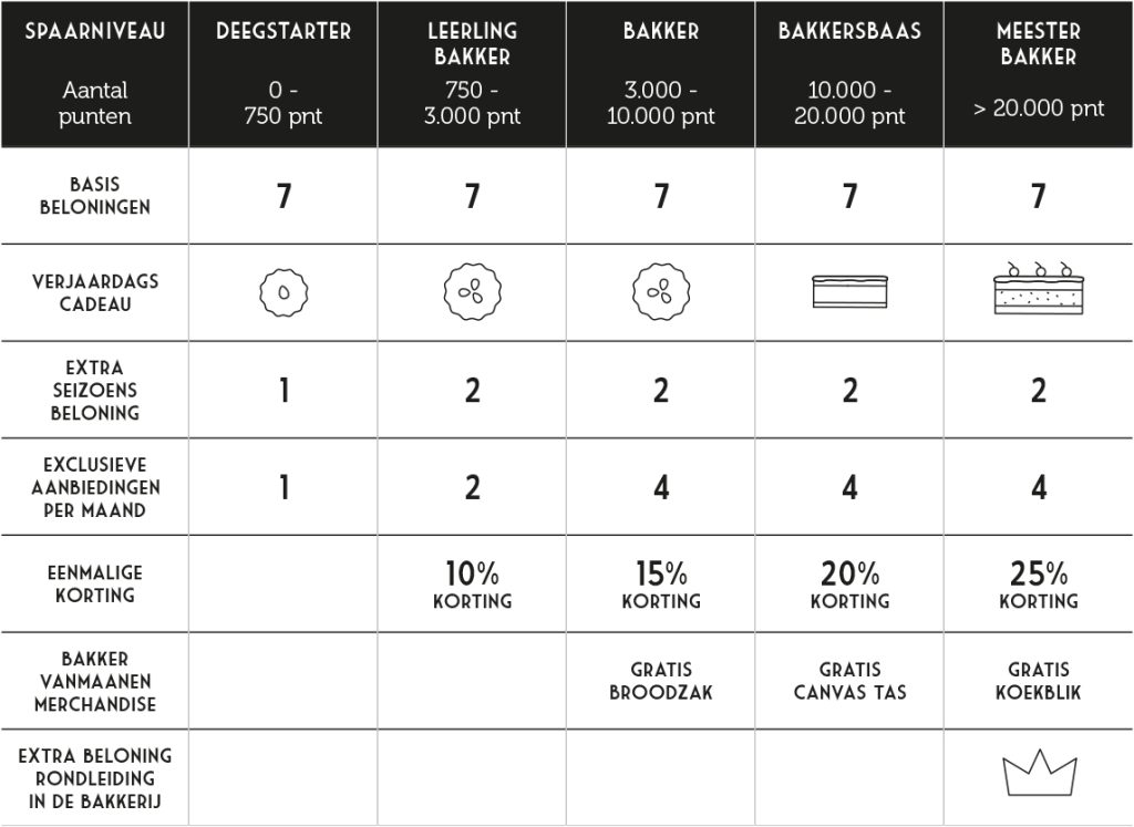Met het Bakker van Maanen spaarprogramma spaar je bij iedere aankoop voor de allerleukste én lekkerste beloningen en extra’s. Voor iedere euro die je bij ons in de bakkerswinkel of in onze webshop besteedt ontvangt je één spaarpunt. Hoe meer punten jij spaart, hoe meer voordelen en leuke extra’s jij ontvangt! Punten die je bij Bakker van Maanen spaart, kunnen alleen bij Bakker van Maanen worden ingeleverd. Jouw punten worden opgeslagen op een Bakker van Maanen klantenkaart of digitaal in de app. Of je nu net begint met sparen of al jarenlang een trouwe spaarder bent: iedere aankoop brengt je dichterbij de volgende beloning!